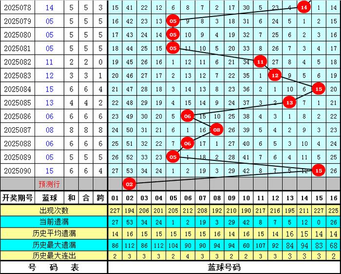 上期开出蓝球号码15,遗漏5期,为热码。目前蓝球遗漏值15以上的冷码有8个:01、02、03、04、07、09、10、16;遗漏值在7-15之间的温码蓝球有3个:11、12、14;遗漏值6以内的热码蓝球有5个:05、06、08、13、15。本期防止冷码蓝球解冻,参考蓝球号码:02、04、07、08、16。