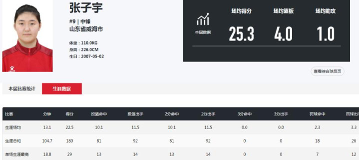 张子宇在本届赛事已经合计出战4场比赛,合计46中44,且后三场比赛全是百分百准星,仅首场比赛13中11丢了两球。张子宇场均13分钟能够得到25.3分4篮板1助攻,4场比赛合计101分,剑指率领山东U18全运女篮夺冠。
