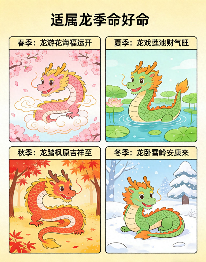 龙,你生来就带着云雨的气息,骨子里刻着不怒自威的气势。可老天是公平的——你在哪个季节落地,它就悄悄给了你不一样的福气。