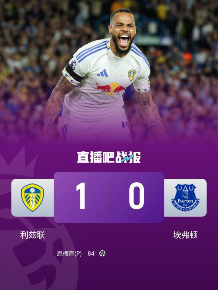 英超第1轮,利兹联在埃兰路球场1-0战胜埃弗顿,利兹联前锋恩梅查在84分钟打进制胜点球。