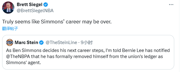 北京时间9月5日,29岁的状元郎本-西蒙斯真要退役吗?据名记Marc Stein报道,经纪人伯尼-李已正式通知球员工会,自己已正式与本-西蒙斯分道扬镳。随后美记者Brett Siegel表示:看起来本-西蒙斯的职业生涯真的要结束了。