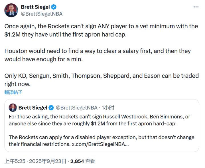 不过随后据名记Brett Siegel报道称,火箭队不能签下威斯布鲁克、本-西蒙斯或其他任何球员,因为他们距离第一个围裙硬工资帽还有大约120万美元。火箭队可以申请伤病球员特例,但这并不能改变他们的薪资限制。