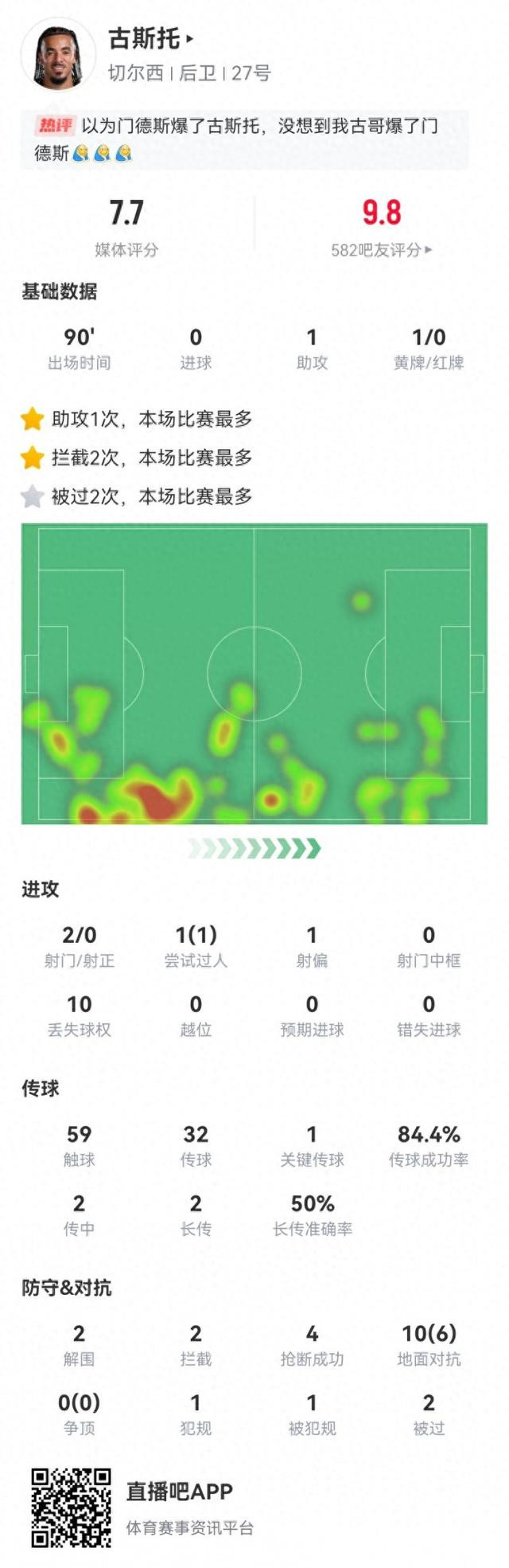 古斯托本场数据: 1助攻+4抢断2解围2拦截 10对抗6成功 获评7.7分