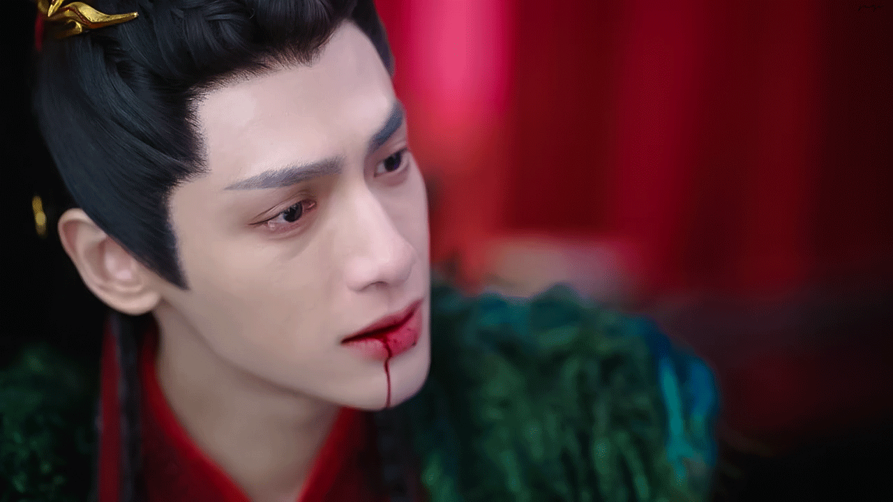 他没有大声宣泄或痛哭流涕,而是眼神流转,满含深情,泪水滑落,口中还在不断涌出献血。