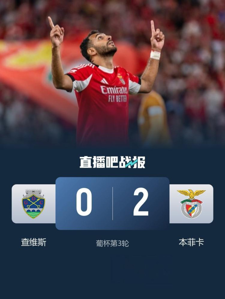 葡萄牙杯赛场,本菲卡2-0击败查韦斯,穆帅的队伍顺利晋级下轮。